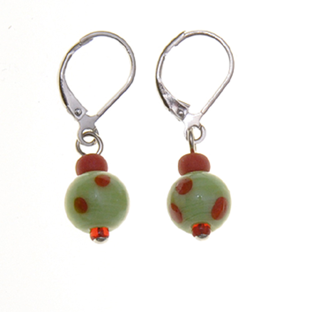Glasohrring je 3 Glasperlen rund rot/hellgrün mit Punkten rot
