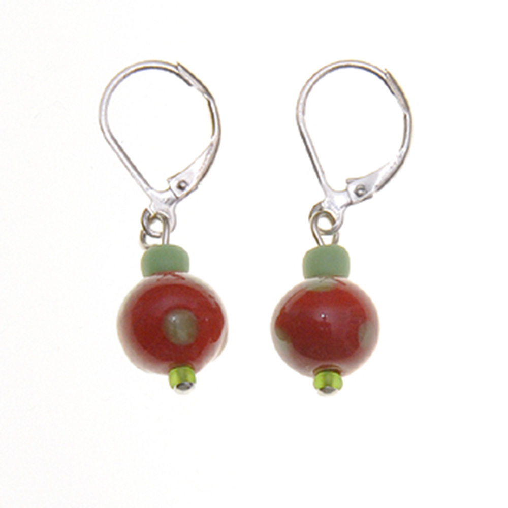 Glasohrring je 3 Glasperlen rund hellgrün/rot mit Punkten grün