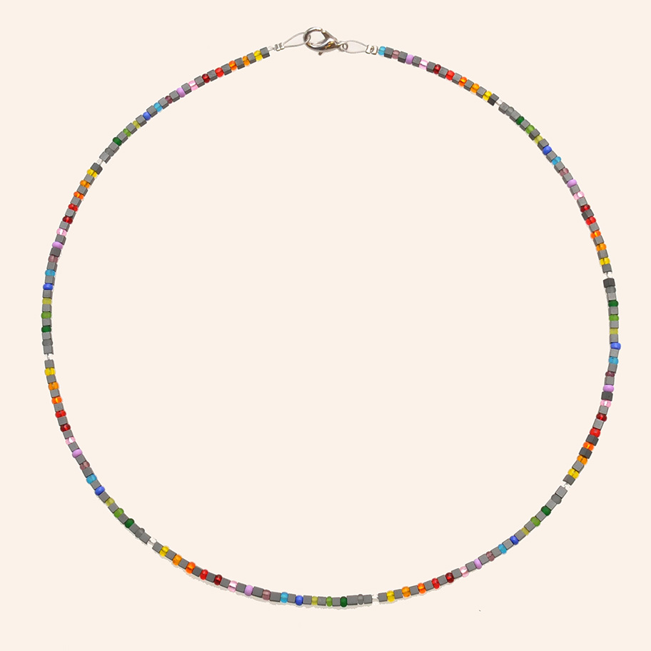 Fädelkette mit sehr kleinen verschiedfarbigen Glasperlen abgetrennt mit dunkelgrauen Hämatitwürfeln Länge ca. 45 cm