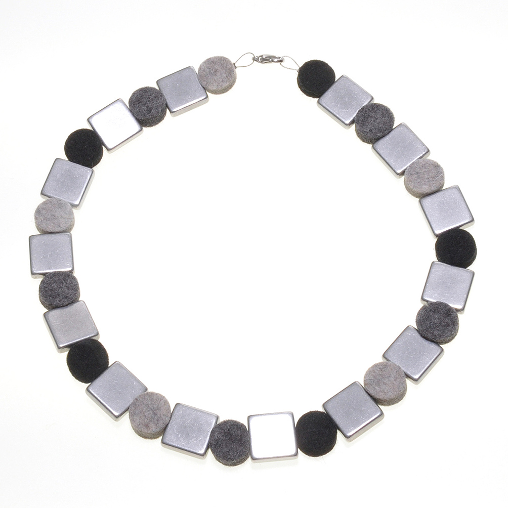 Wollfilzkette 13x Aluquadrat Vollmat. 15x15 mm Wollfilz schwarz / dunkelgrau / hellgrau Länge ca. 43 cm