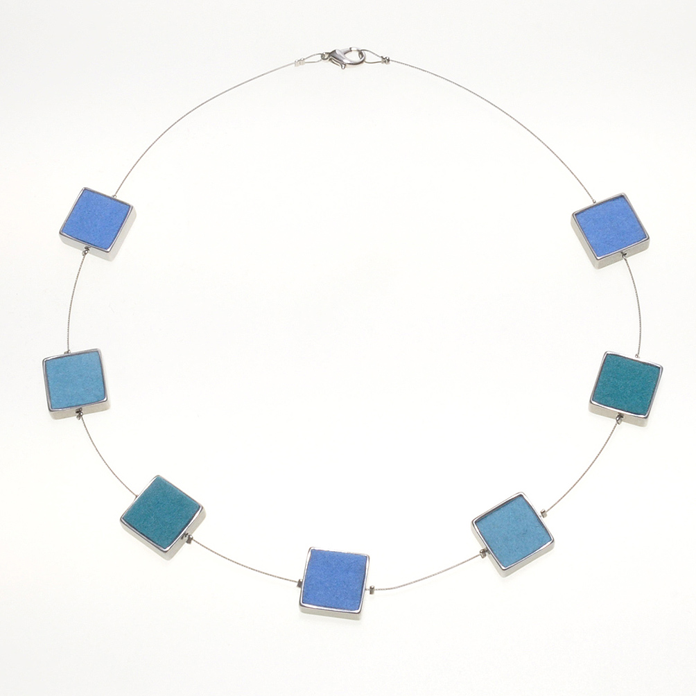 Wollfilzkette 7x Aluquadrat 15x15 mm Wollfilz hellblau / helltürkis / dunkeltürkis  Länge ca. 43 cm