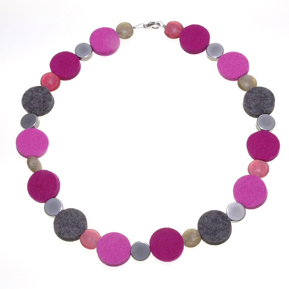 Wollfilzkette 7x Aluvollmaterial rund 12 mm/8x Glasperle / 14x Filz rund 20 mm fuchsia/pink/dunkel./ Länge ca. 48 cm