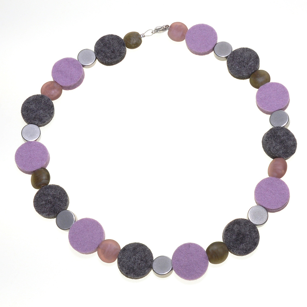 Wollfilzkette 7x Aluvollmaterial rund 12 mm/8x Glasperle / 14x Wollfilz rund 20 mm dunkelgrau/malve Länge ca. 48 cm