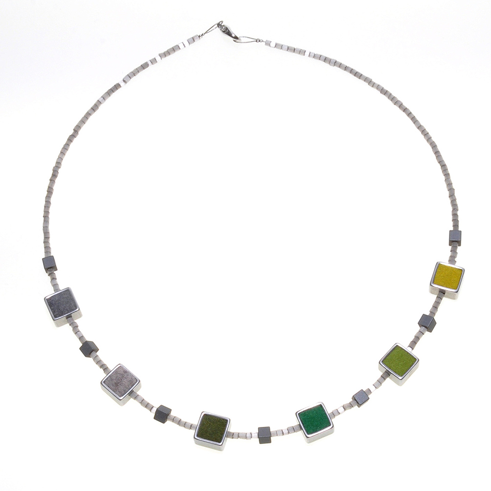 Wollfilzkette mit 6x Quadraten aus Alu 10 x 10 mm und 6 verschiedenfarbigen Wollfilzeinsätzen mit Hämatit-Würfeln und vielen kleinen Glaswürfeln Länge ca. 46 cm
