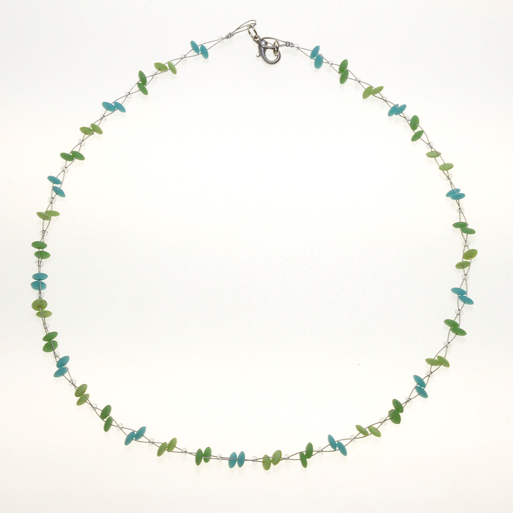 Fädelkette doppelt gefädelt mit Glaslinsen in den Farben hellgrün und dunkelgrün und helltürkis Länge ca. 48 cm