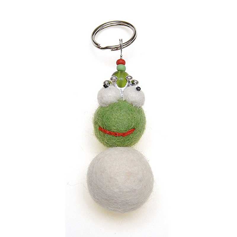 Schlüsselanhänger Frosch Filzkugel weiß, Froschkopf, Metallkrone, Glasperlen grün rot mit Wollfilz gefertigt