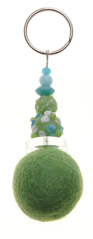 Schlüsselanhänger Filzkugel kiwi mit Plexischeibe und verschiedenfarbigen Glasperlen