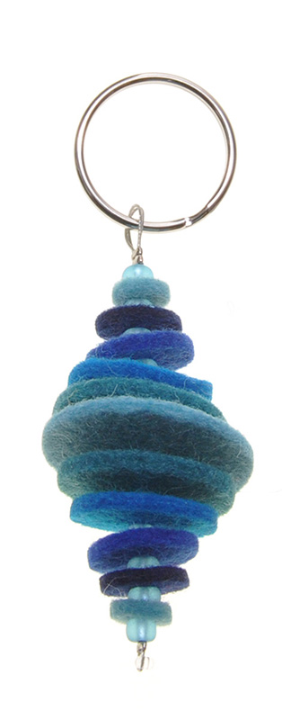Schlüsselanhänger mit 11 veschieden großen Wollfilzscheiben in den Farben türkis / blau / schwarz und mit kleinen Glasperlen