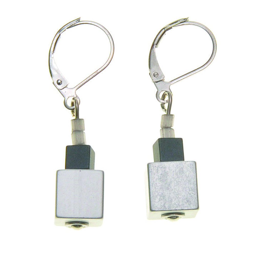 Ohrring mit Würfeln aus Hämatit ca. 4 mm x 4 mm und mit Würfeln aus eloxiertem Aluminium ca. 8 mm x 8 mm in silber