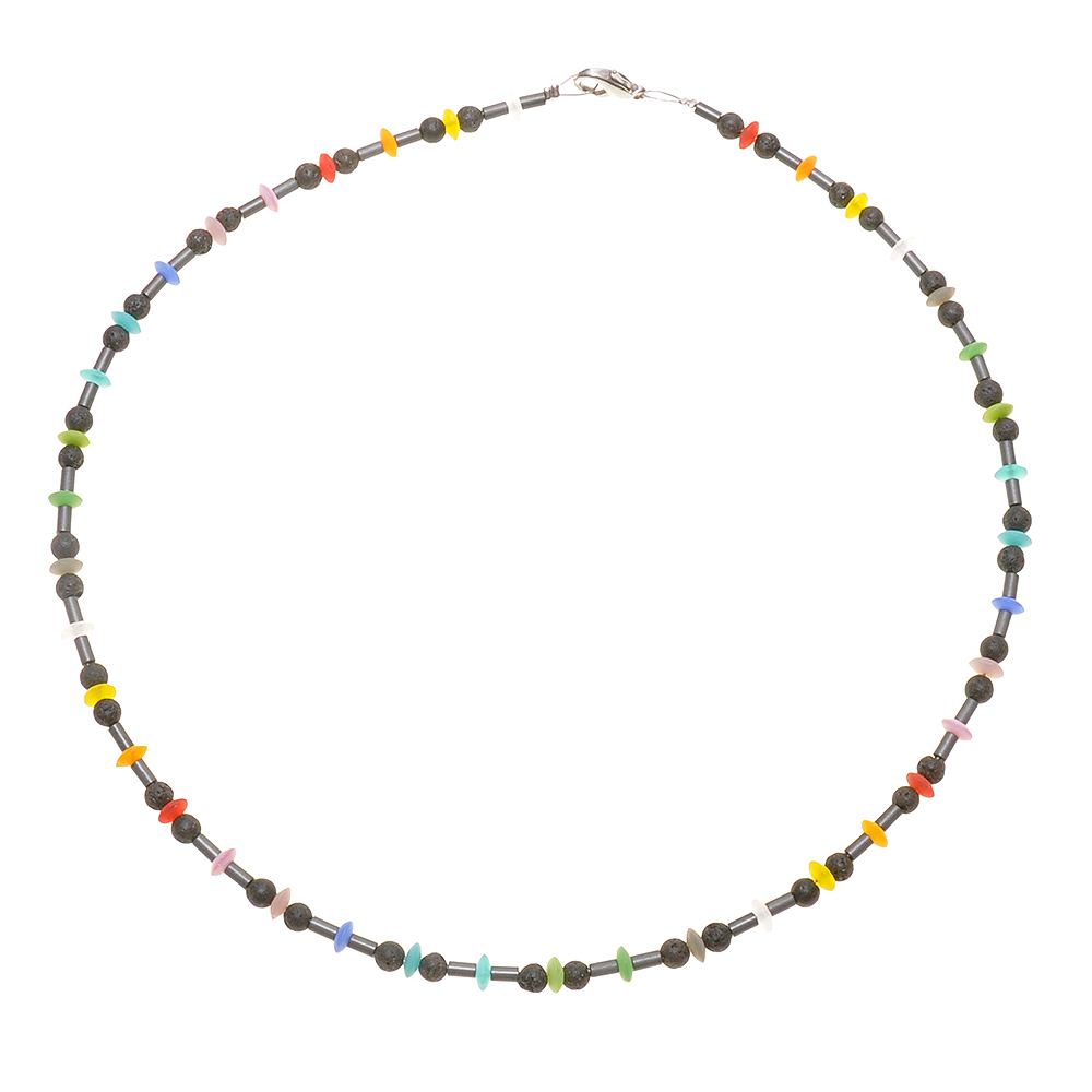 Kette mit Glaslinsen in multifarben und mit kleinen Hülsen aus Hämatit und mit kleinen Kugeln aus Lava Länge ca. 45 cm
