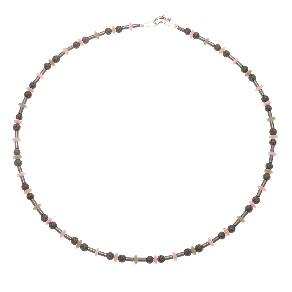 Kette mit Glaslinsen in den Farben hellgrau und rosa und malve und mit kleinen Hülsen aus Hämatit und mit kleinen Kugeln aus Lava Länge ca. 45 cm