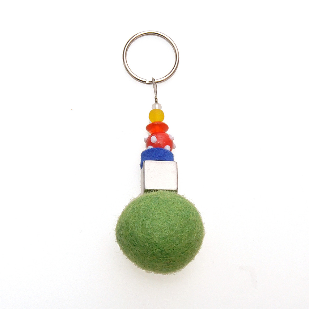 Schlüsselanhänger mit einer Wollfilzkugel in kiwi und einer Wollfilzscheibe in royalblau und einem Würfel aus Alu und diversen Glasperlen