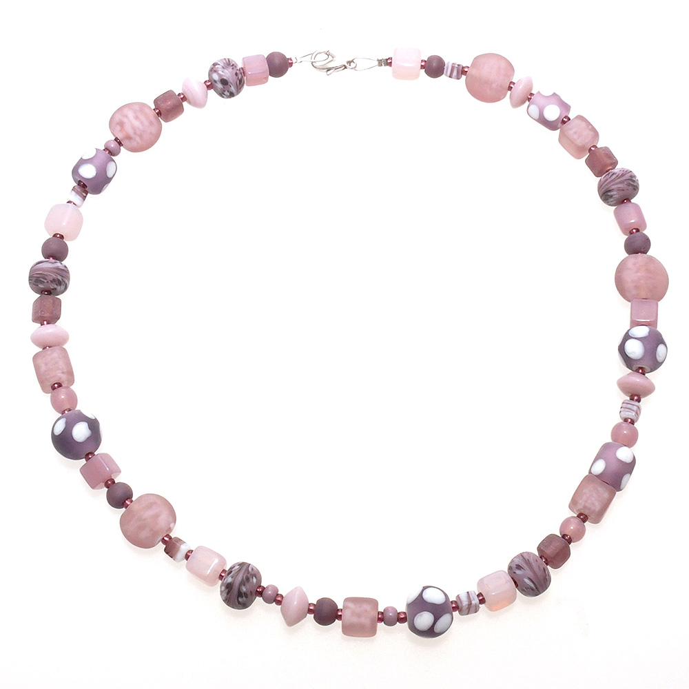 Fädelkette mit Glaslinsen in den verschiedensten Formen und Größe der Perlen in den Farben malve und lila Länge ca. 45 cm