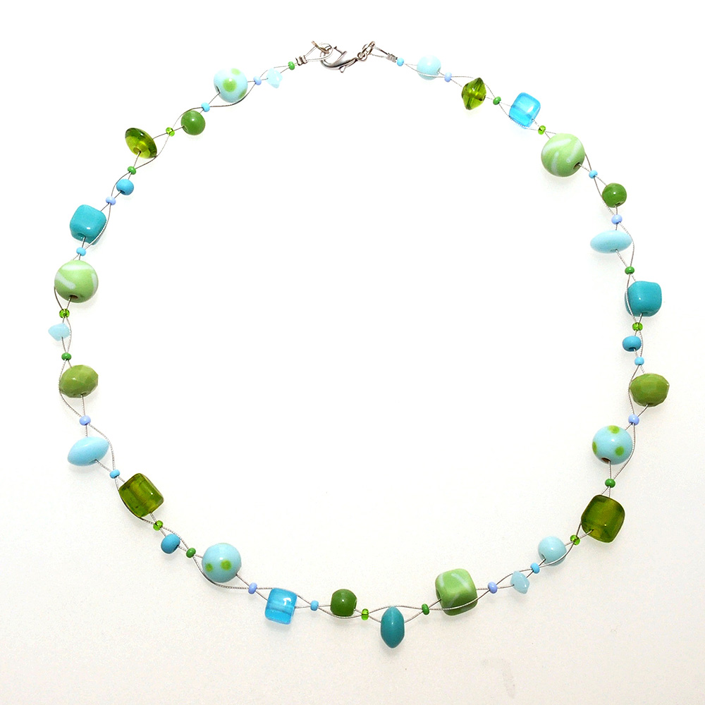 Fädelkette doppelt gefädelt mit verschieden großen und kleinen Glasperlen in verschiedenen Formen in den Farben helltürkis, hellblau, hellgrün Länge ca. 45 cm