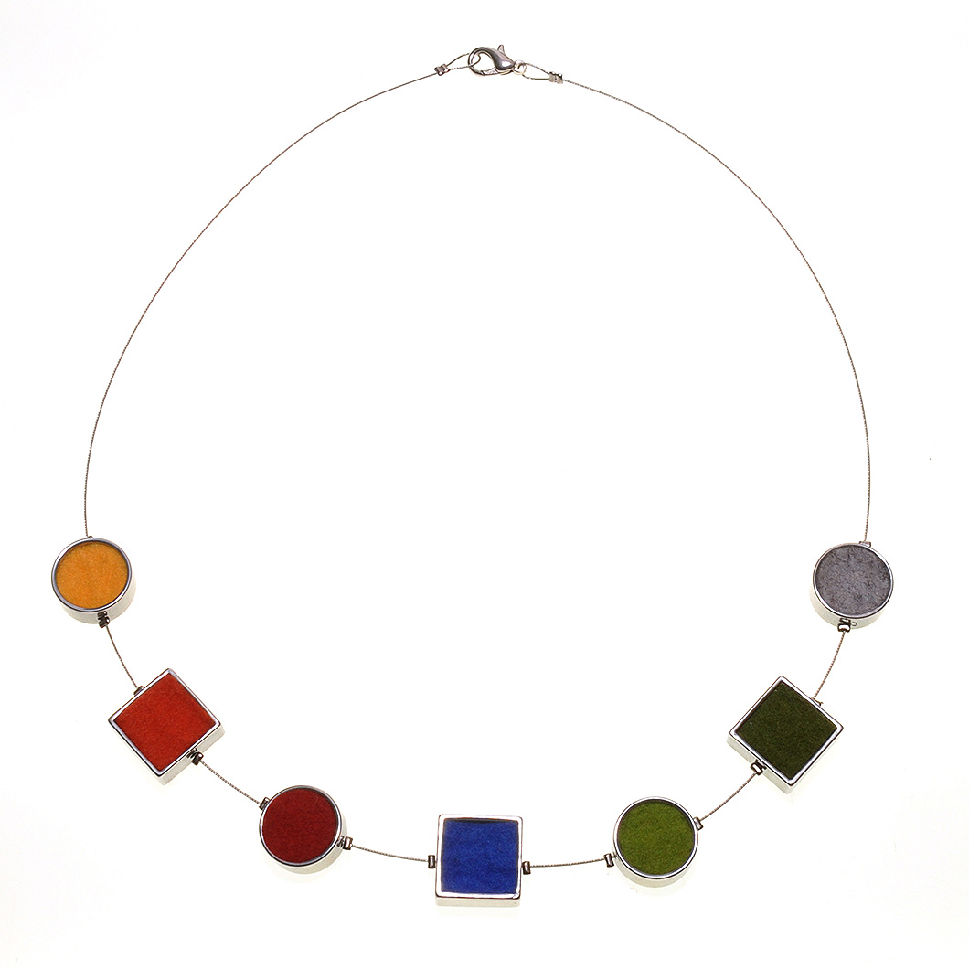 Wollfilzkette mit 3x Aluquadrat 10x10 mm und 4x Aluring Ø 15 mm mit Wollfilz in gelb, orange, rot, royalblau, kiwi, tanne und hellgrau Länge ca. 45 cm