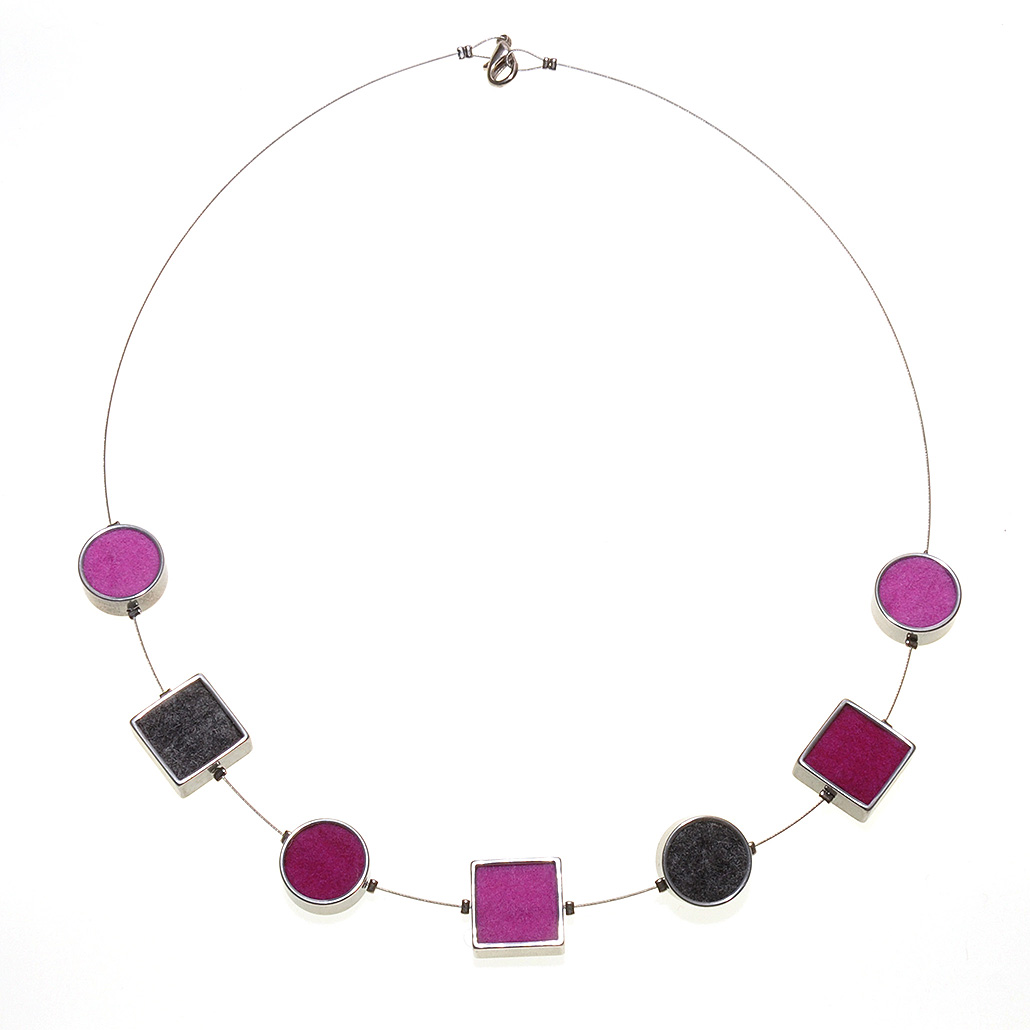 Wollfilzkette mit 3x Aluquadrat 10x10 mm und 4x Aluring Ø 15 mm mit Wollfilz in pink, fuchsia, dunkelgrau Länge ca. 45 cm