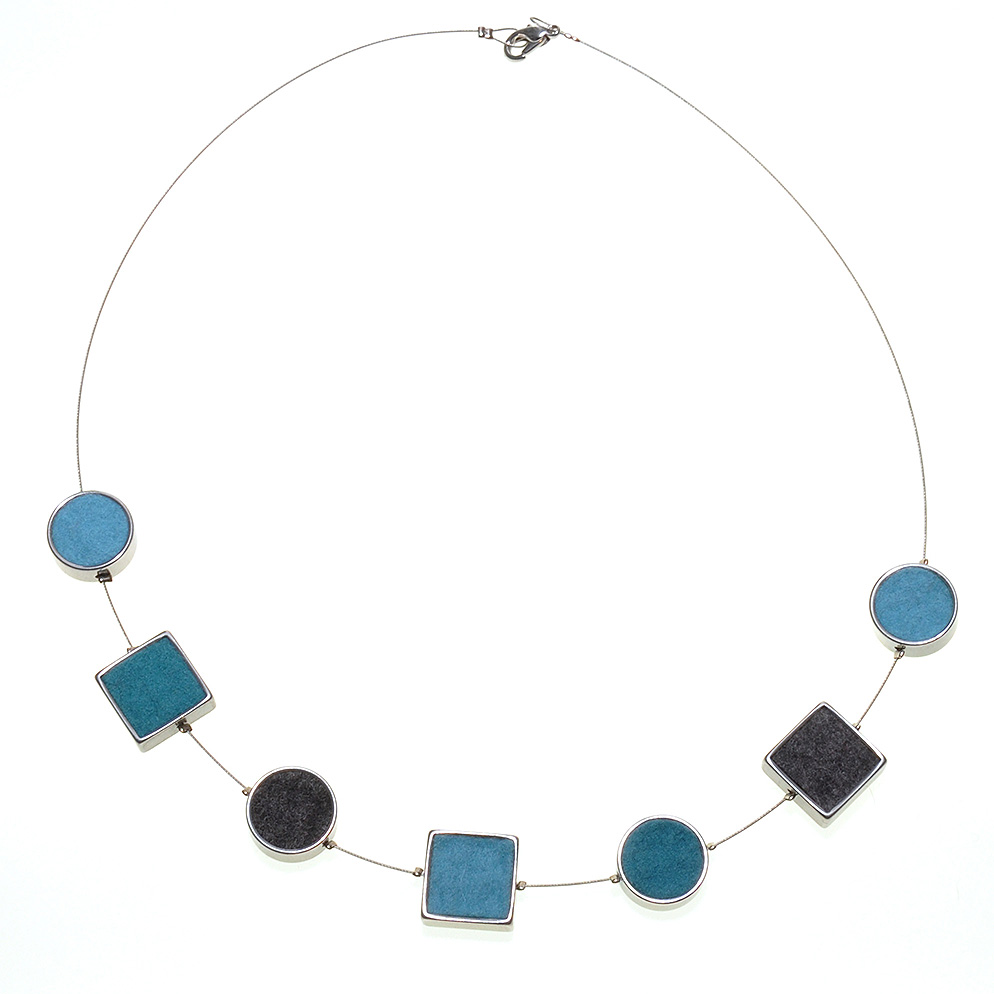 Wollfilzkette mit 3x Aluquadrat 10x10 mm und 4x Aluring Ø 15 mm mit Wollfilz in hell- und dunkeltürkis und dunkelgrau Länge ca. 45 cm