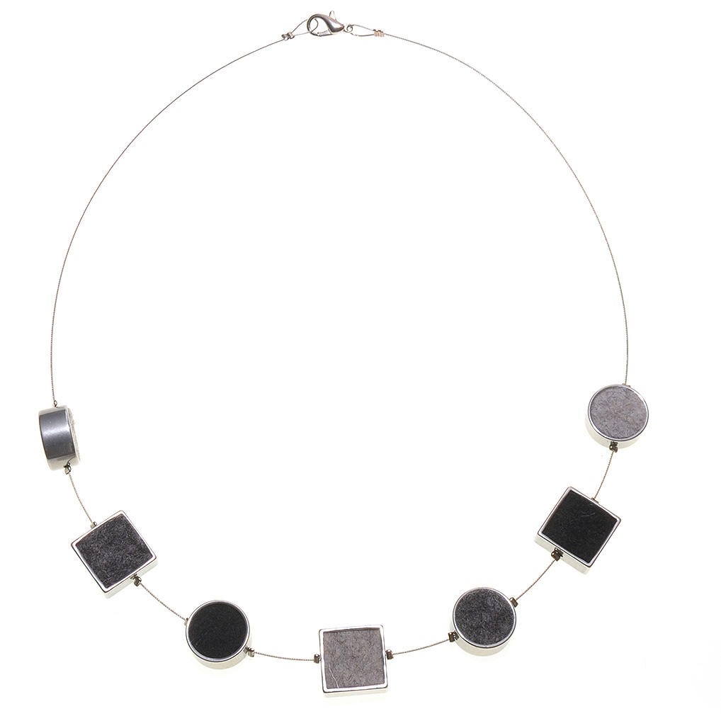 Wollfilzkette mit 3x Aluquadrat 10x10 mm und 4x Aluring Ø 15 mm mit Wollfilz in hell- und dunkelgrau und schwarz Länge ca. 45 cm