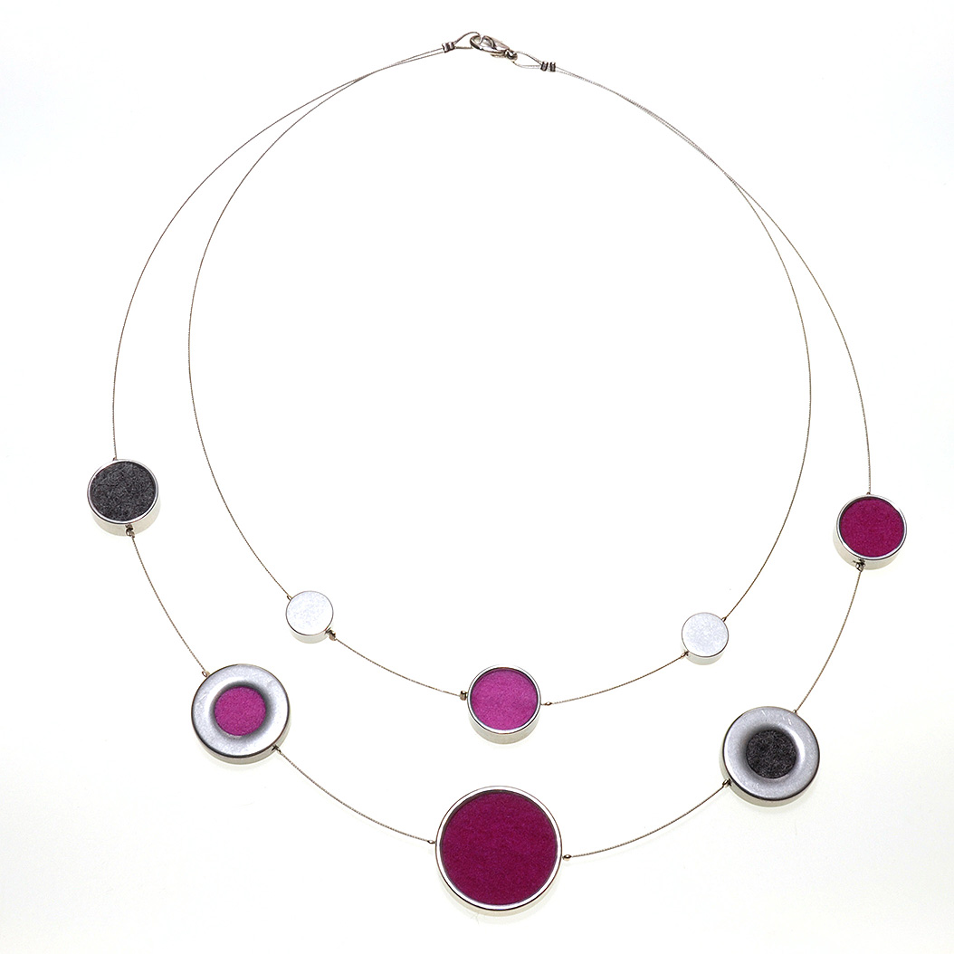 Wollfilzkette 2.-Reihig gefädelt: 1. Reihe mit 2x Aluring aus Vollmaterial und Aluring Ø 15 mm mit Wollfilz pink. 2 Reihe mit 2x Aluring Ø 15 mm mit Wollfilz dunkelgrau, fuchsia 1x Aluring Ø 25 mm mit Wollfilz fuchsia u. 2x Aluring Ø 20 mm mit Wollfilz pink u. dunkelgrau