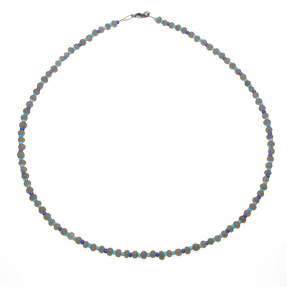 Fädelkette mit kleinen Glasperlen in hellgrau und sehr kleinen Glasperlen in den Farben dunkel- und helltürkis und blau Länge ca. 45 cm