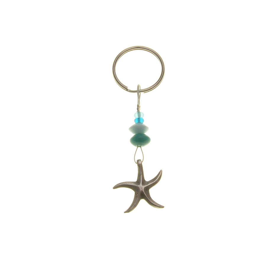 Schlüsselanhänger aus Metall Motiv Seestern mit verschiedenen Glasperlen in hell- und dunkeltürkis