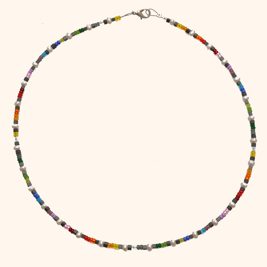 Fädelkette mit kleinen Glasperlen in bunt, Hämatitwürfel, Süßwasserperlen Länge ca. 45 cm