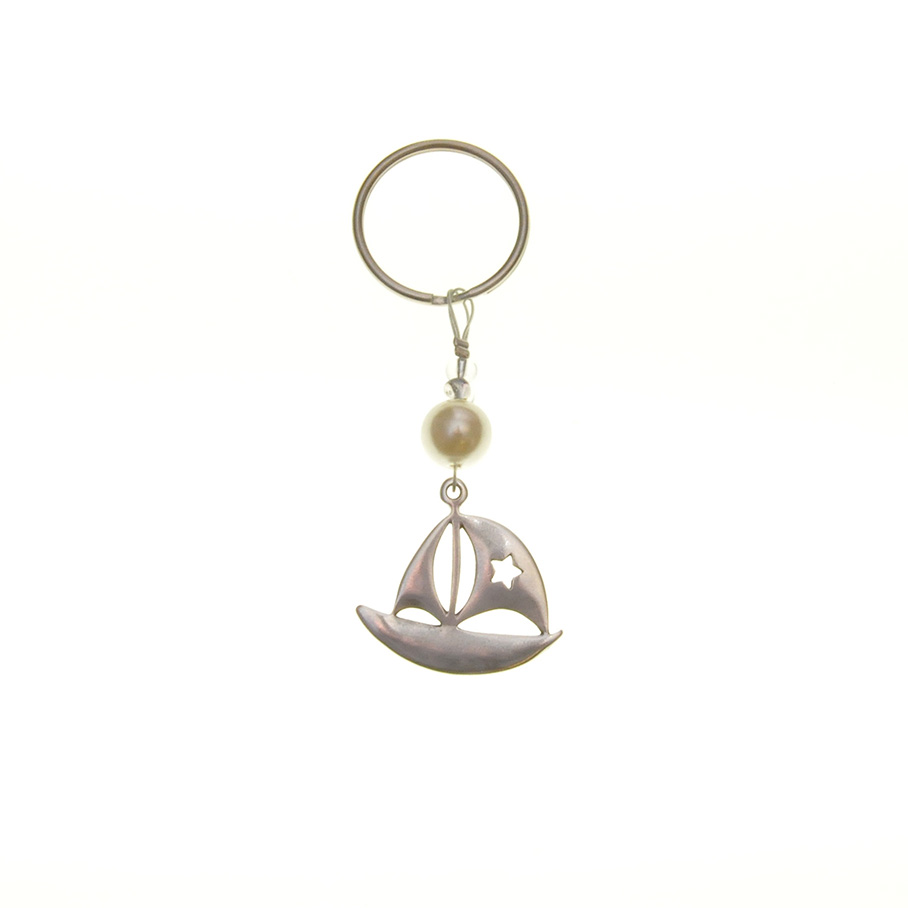 Schlüsselanhänger aus Metall Motiv Segelschiff, Glasperlen weiß